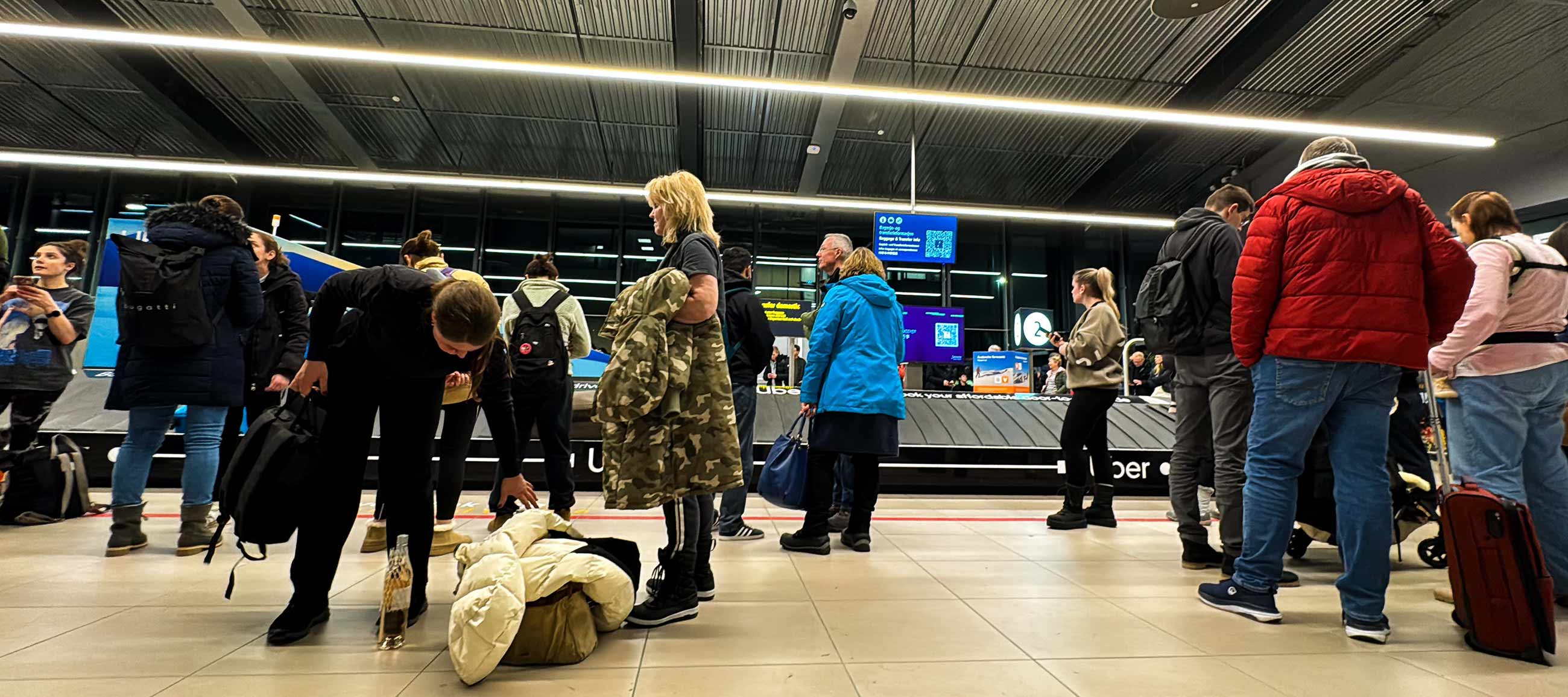 Italiener, Deutsche und Niederländer stapeln sich in der Gepäckhalle.