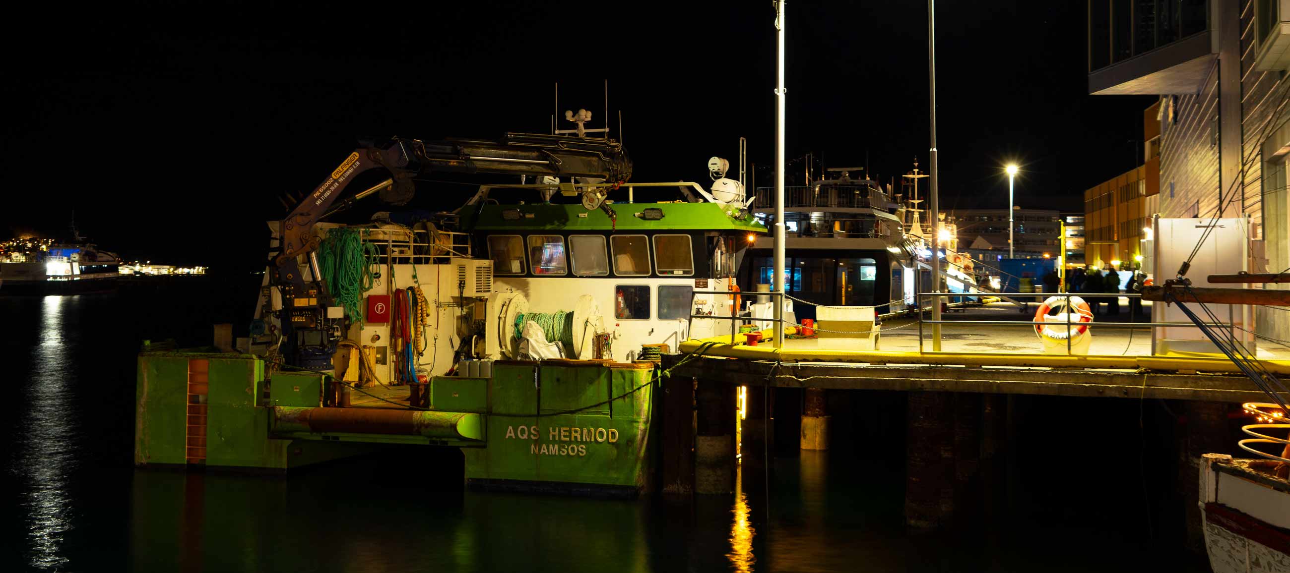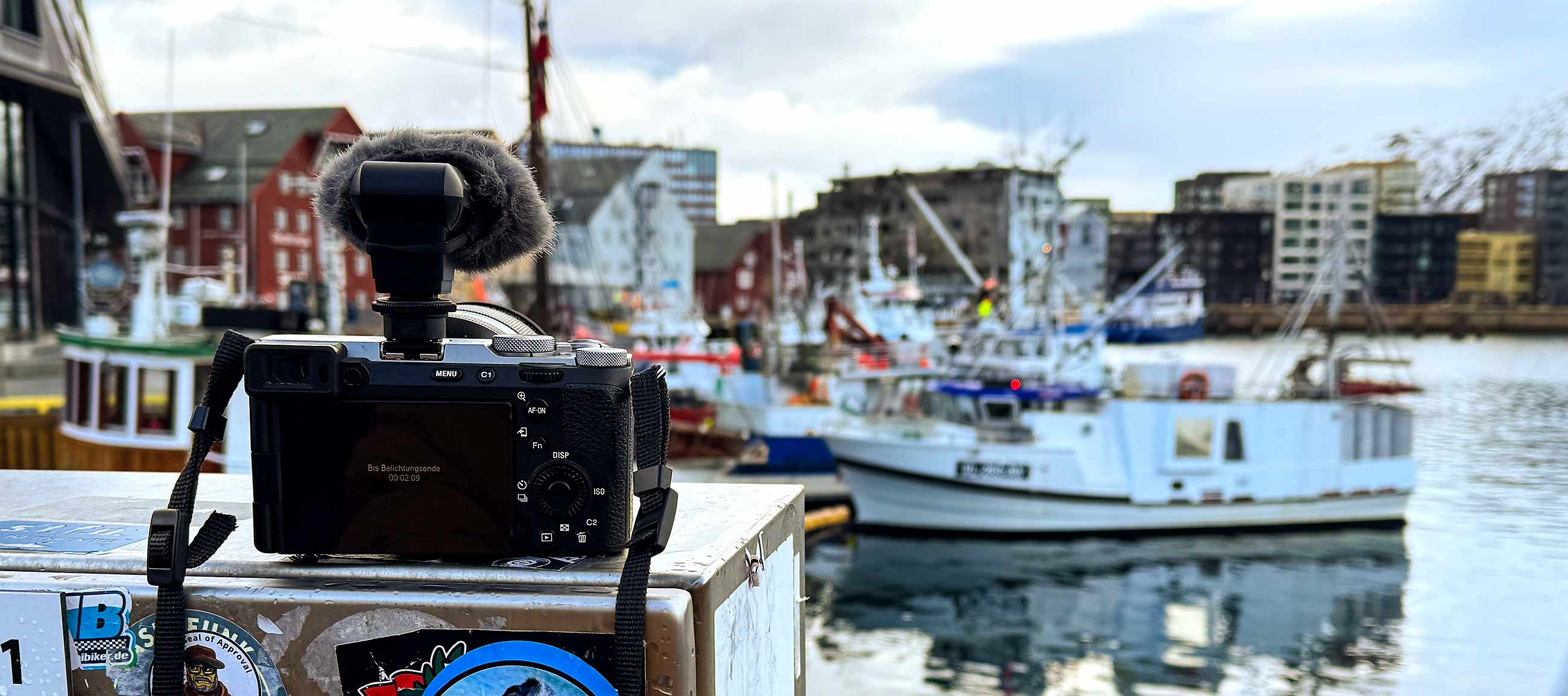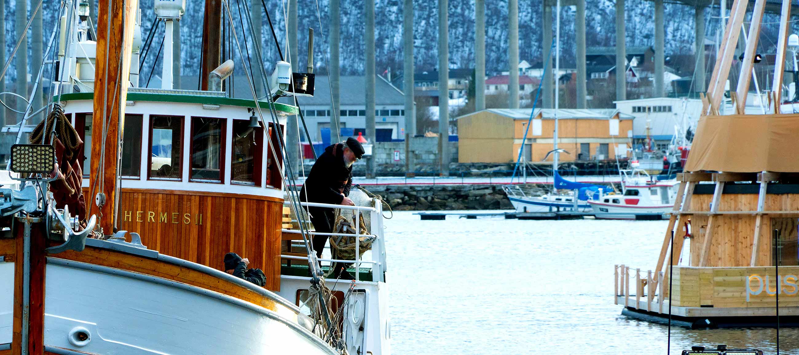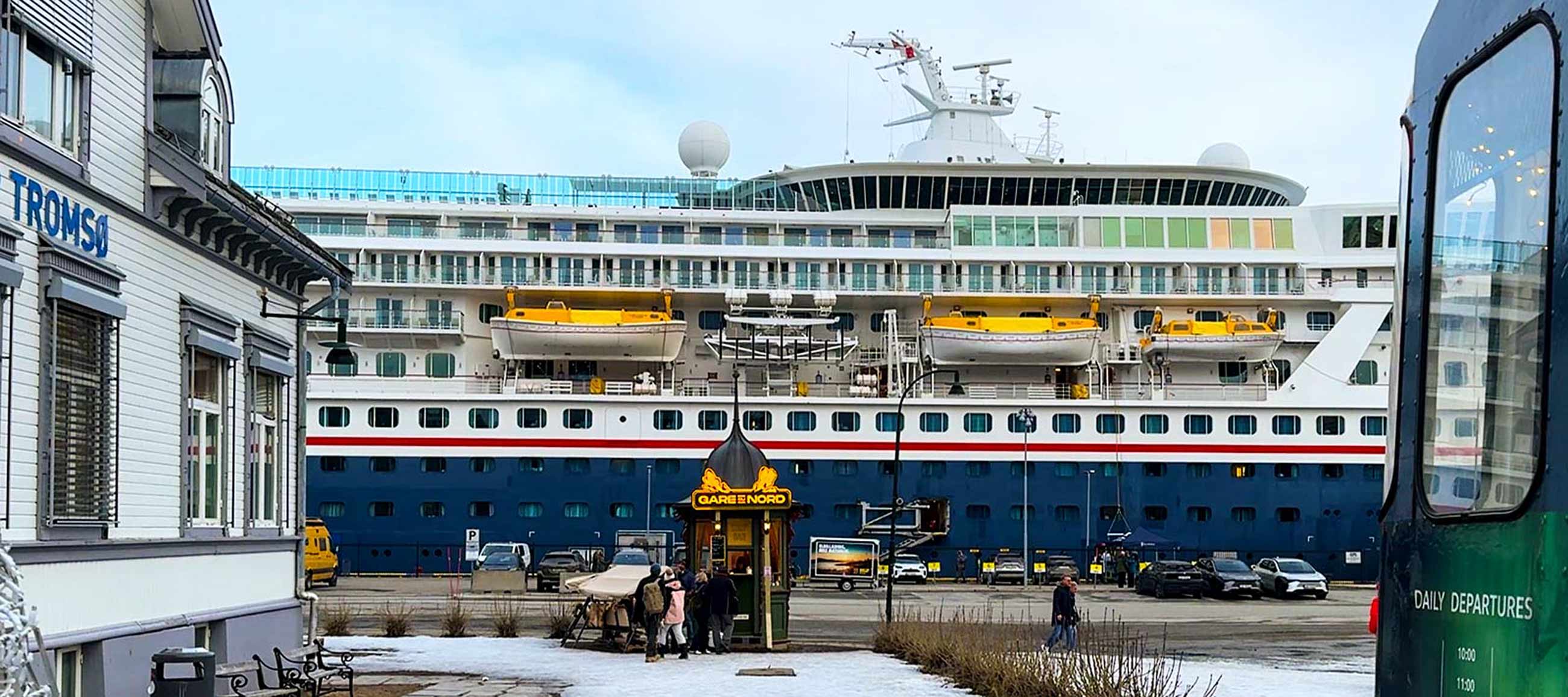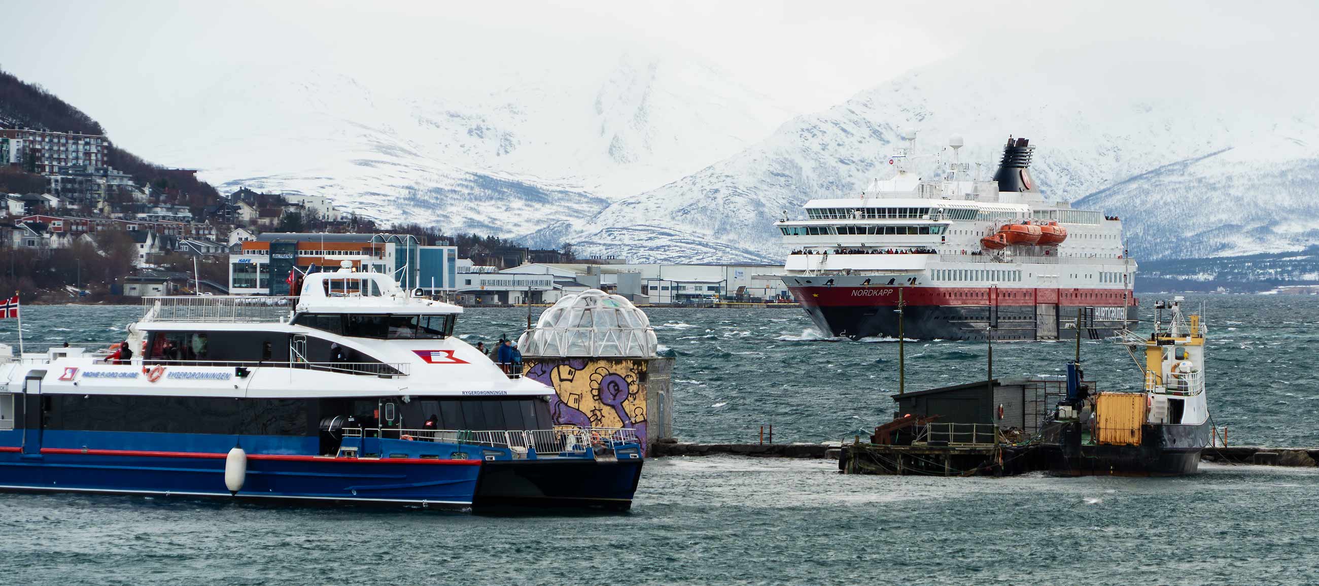 Ich hänge in reichhaltiger Gesellschaft im Kystens Hus rum, bis der nächste Regen-/Schneeschauer vorbei ist, gehe dann rüber zum Hurtigrutenkai –
