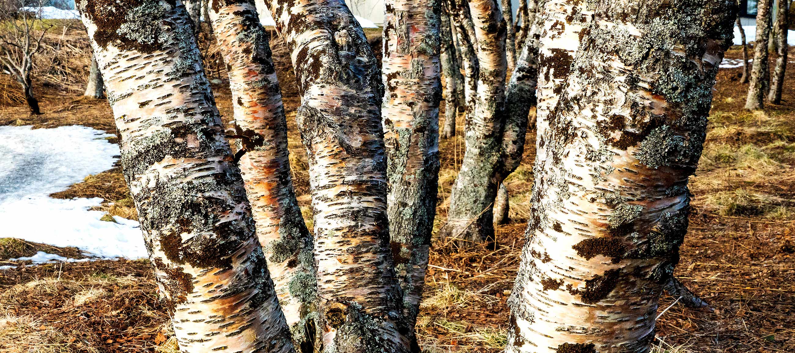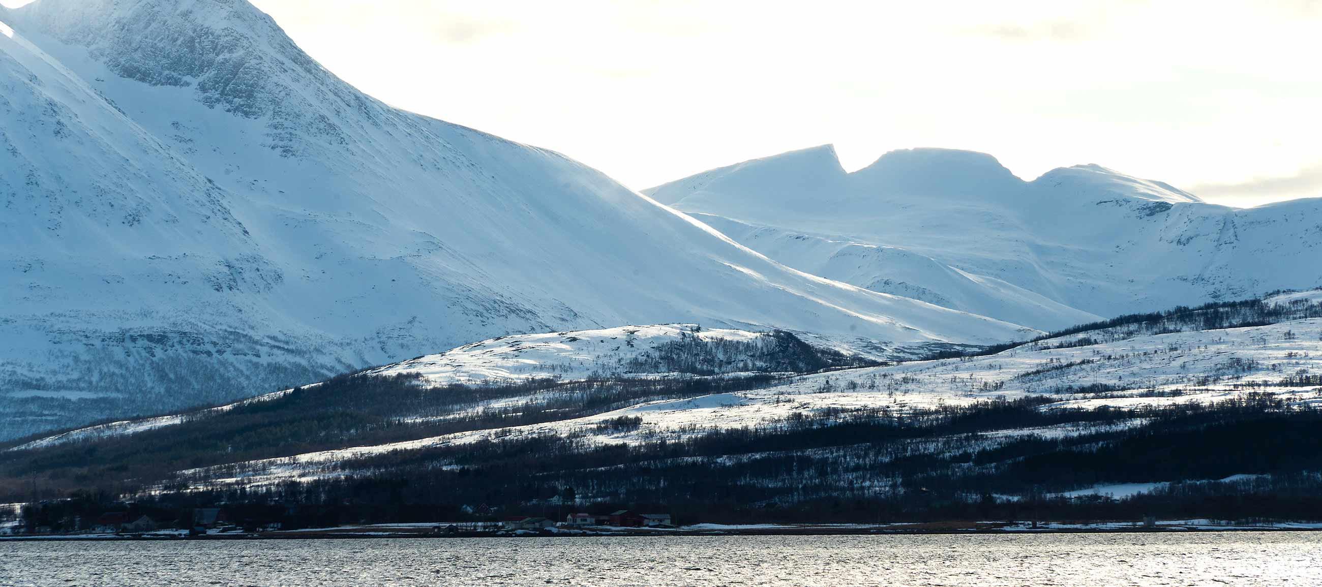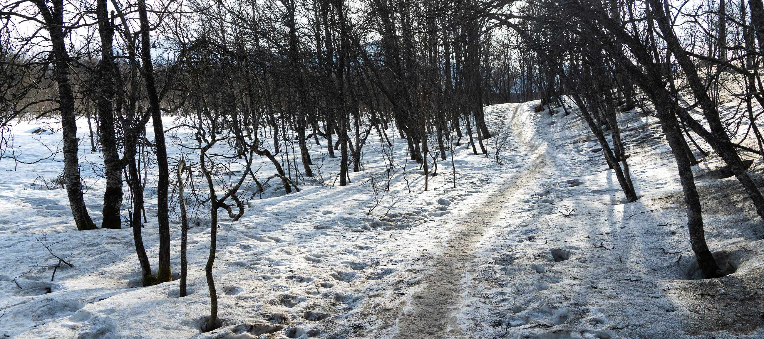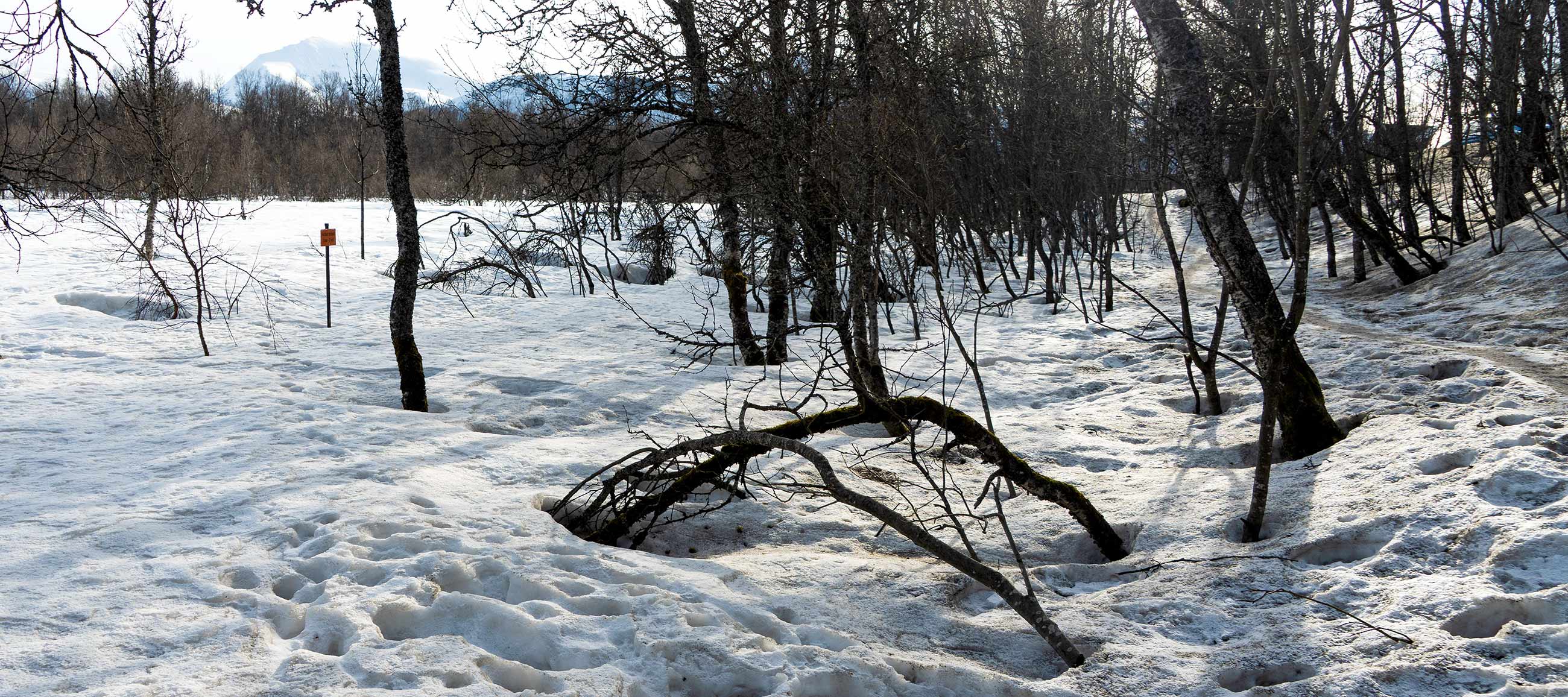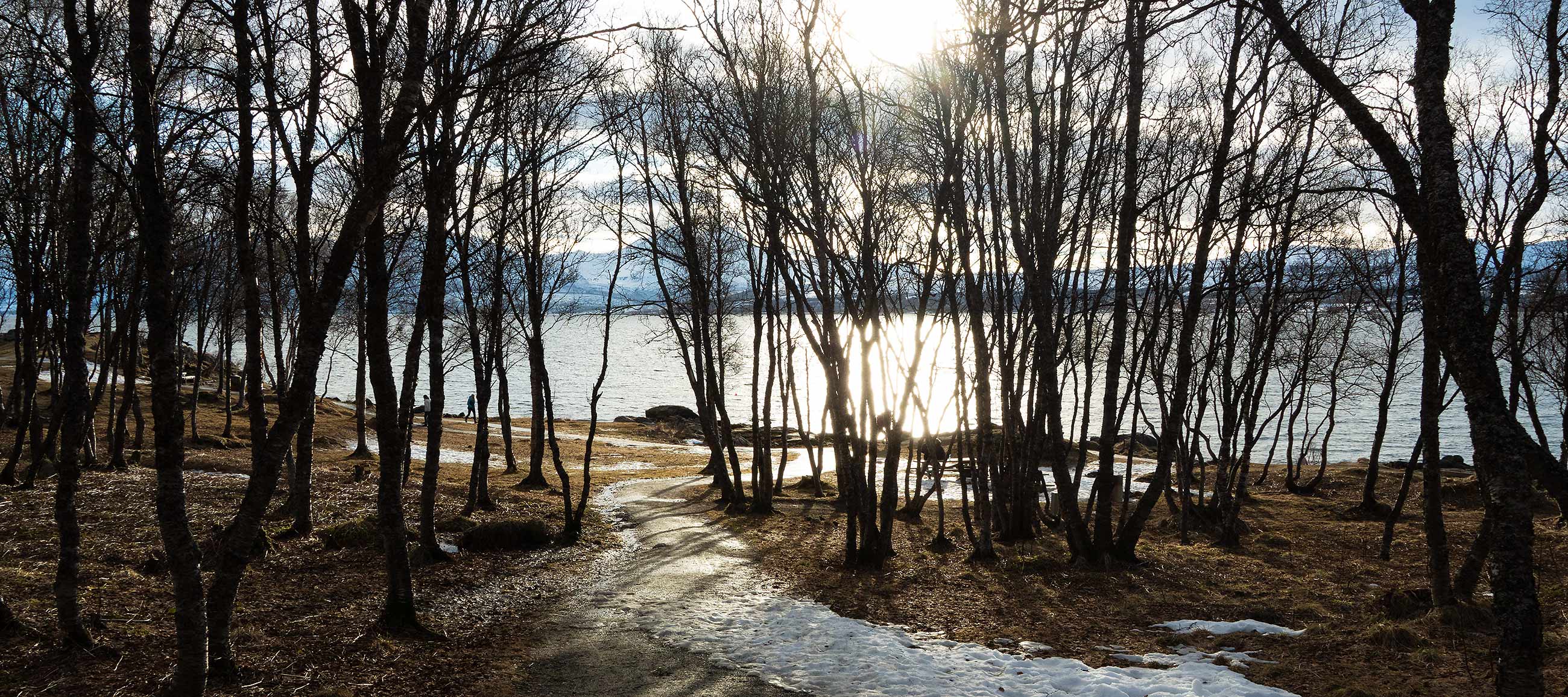 Ein uriges Gebiet, krumme Bäume und Pfade ans Wasser, Sonne von gegenüber, im Hintergrund schneebedeckte Berge.
