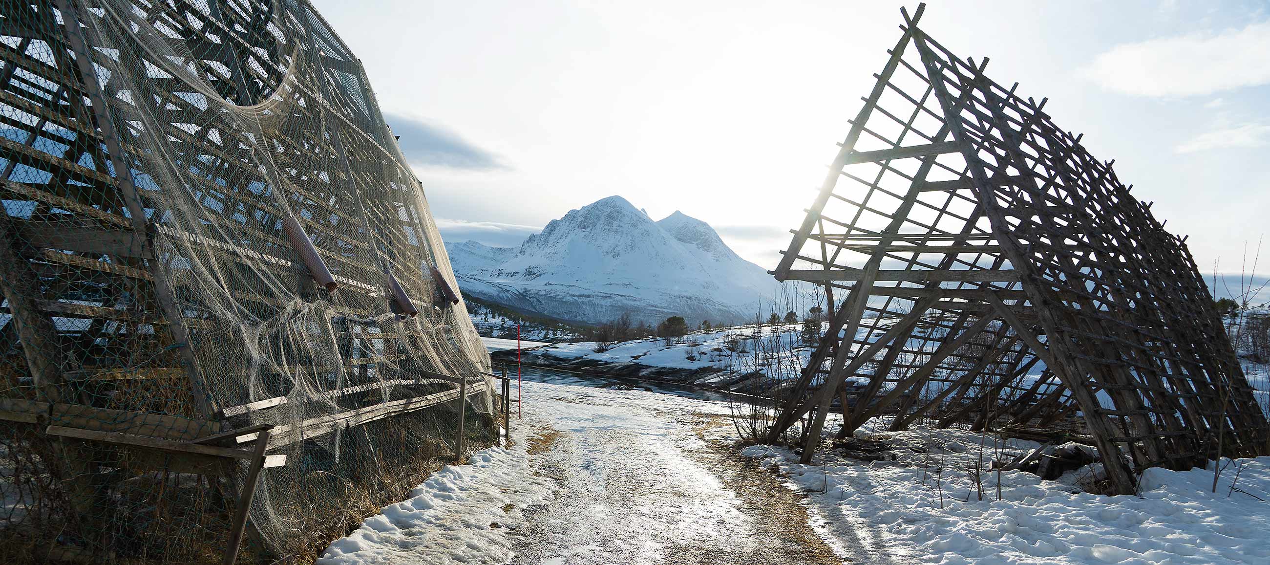Wir besuchen eine alte Fischfabrik und sehen Elchhaufen direkt neben Fischtrockengestellen.