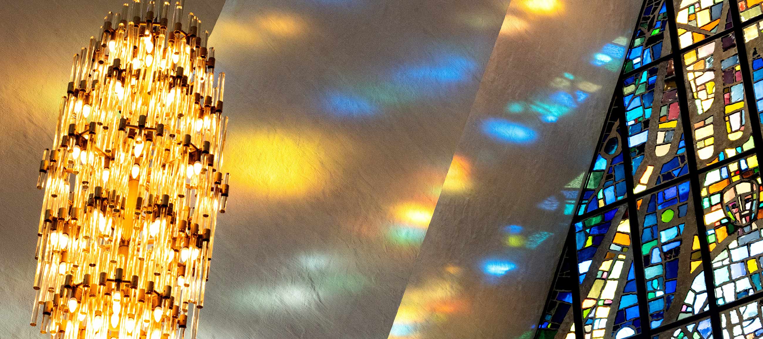 Die Morgensonne scheint durch das bunte Fenster und bringt die Farben zum Leuchten. Der Flügel ist perfekt poliert.